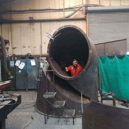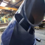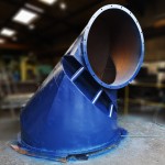 Sam, from our welding and fabrication division, is giving this beast a sense of scale by standing inside it during fabrication. This Planetary Cooler Elbow was fabricated and welded in-house and is 2.5m wide and stands 3m high. The finished item can be seen below and this has now been despatched to a Cement Plant in Ireland. Click on the images below to open a larger view.
